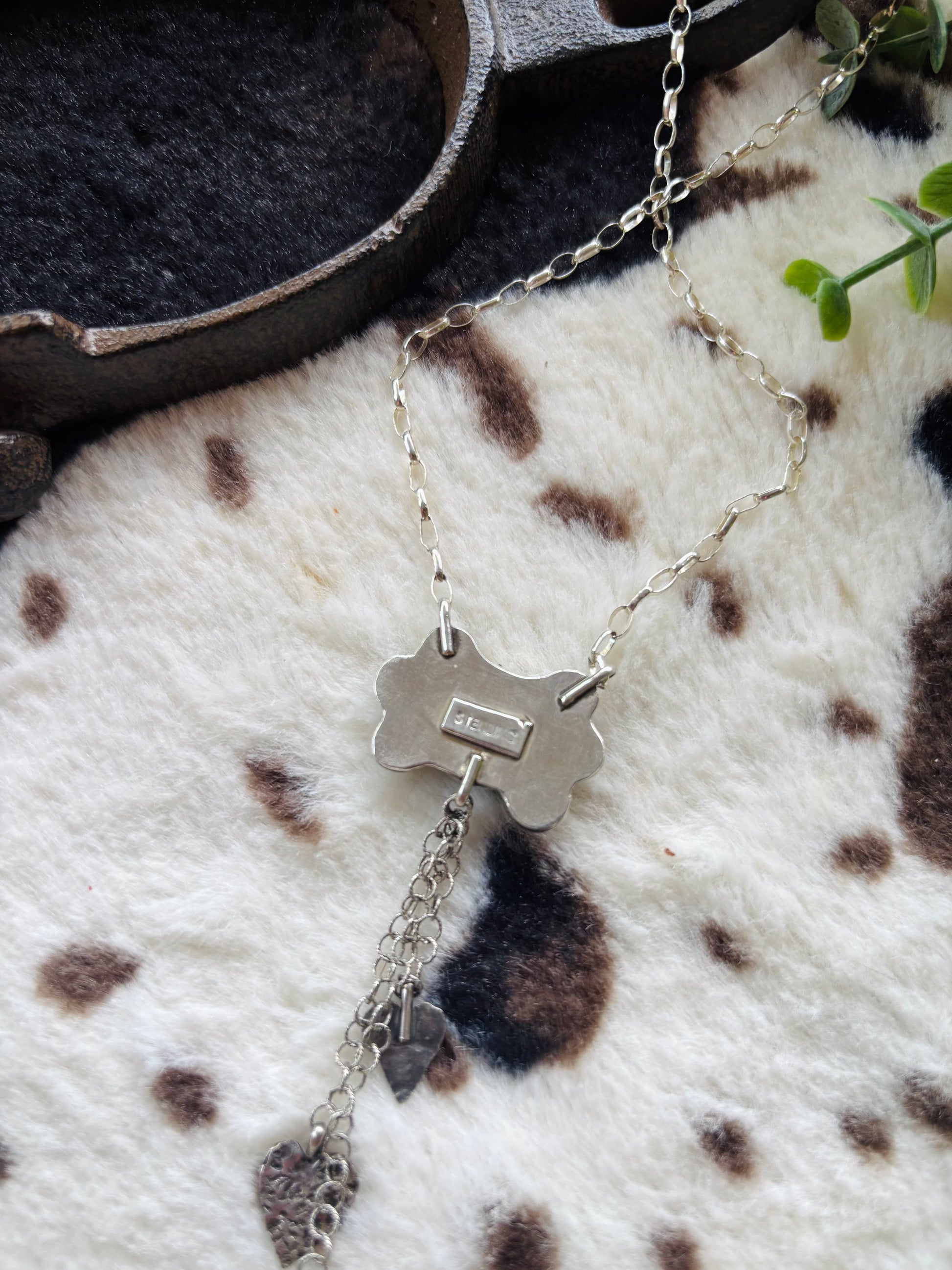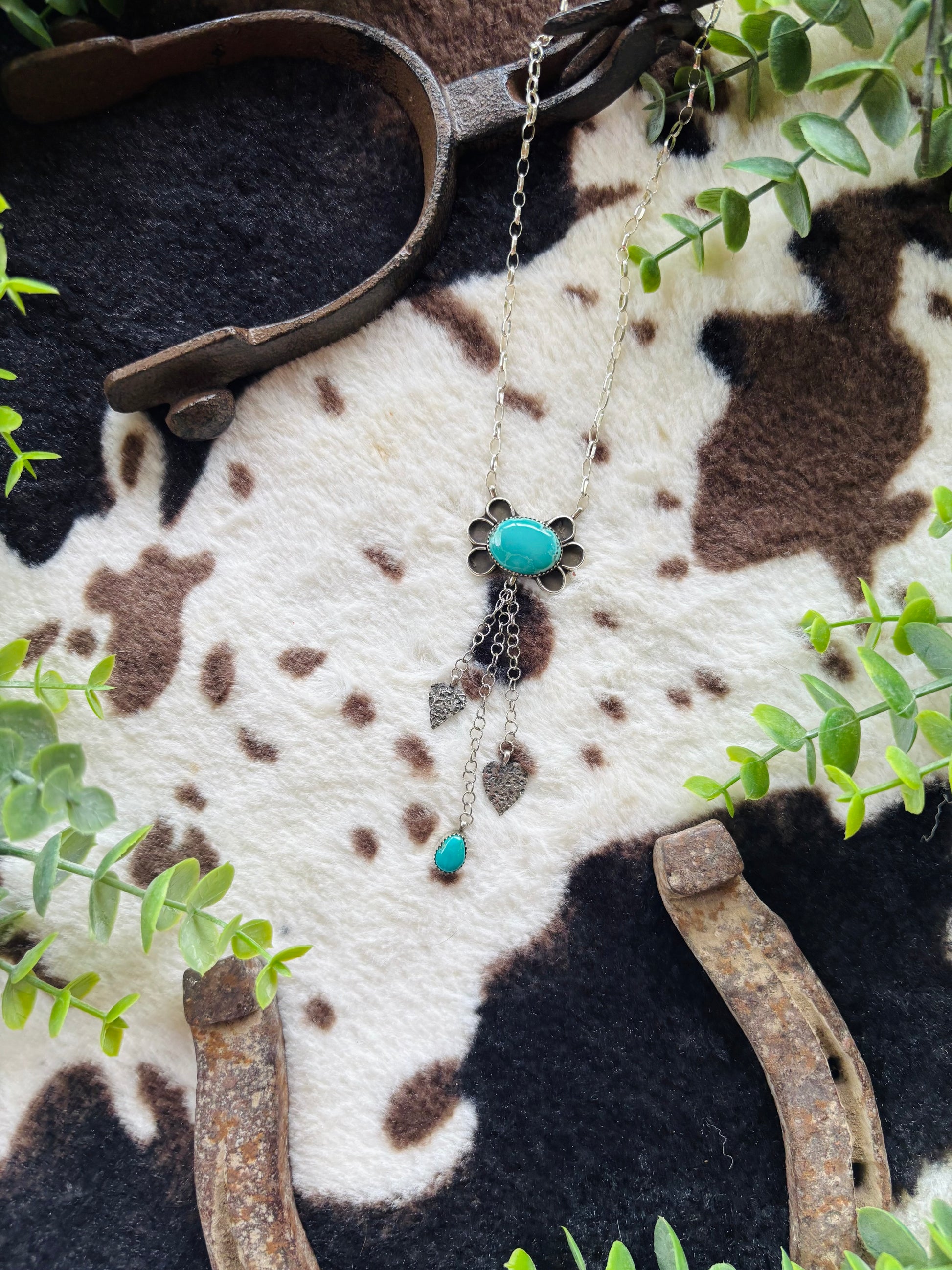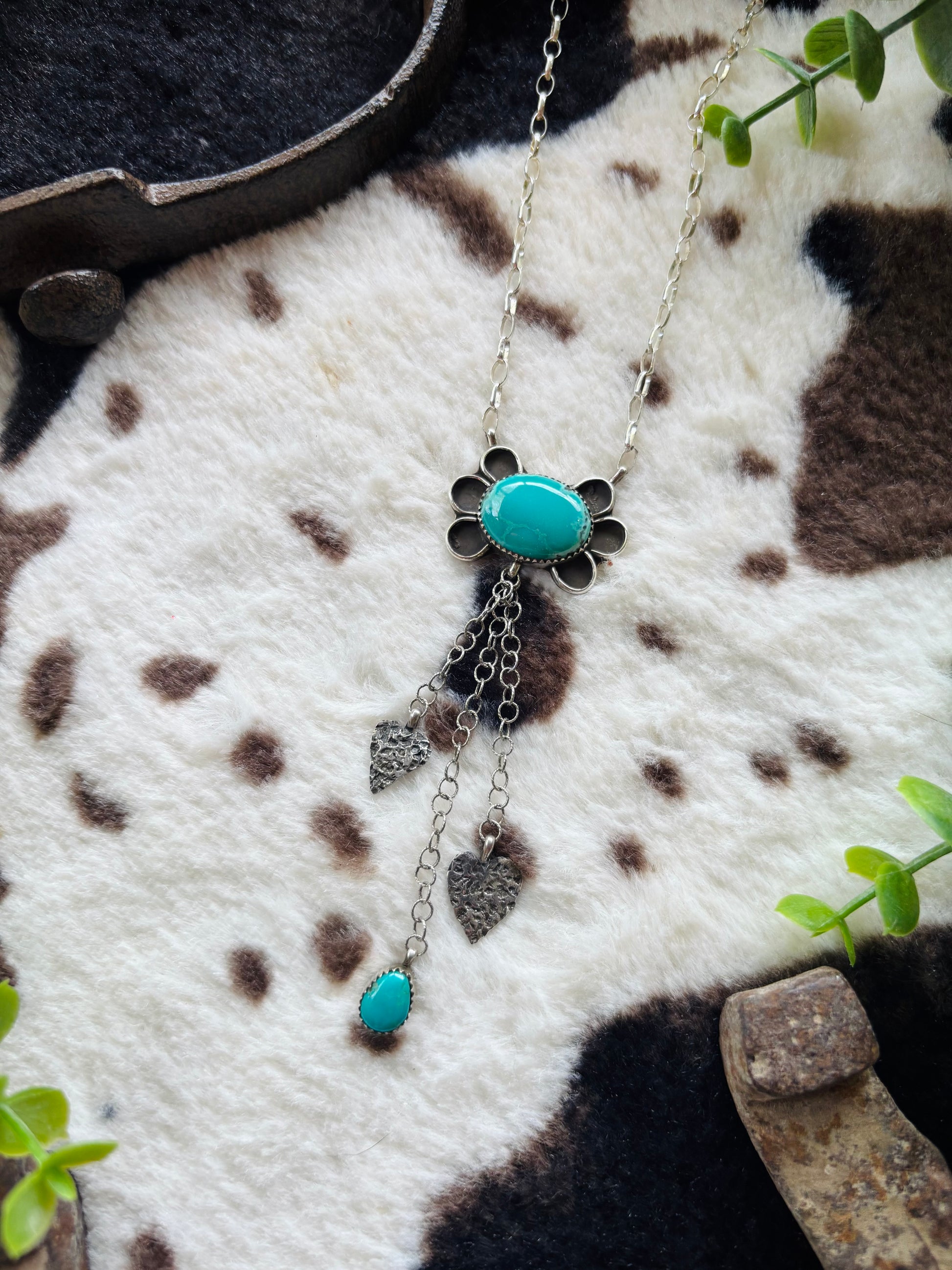 High grade evan’s turquoise and kingman turquoise stones, with entirely handmade sterling silver charms.